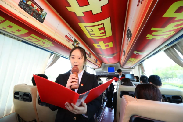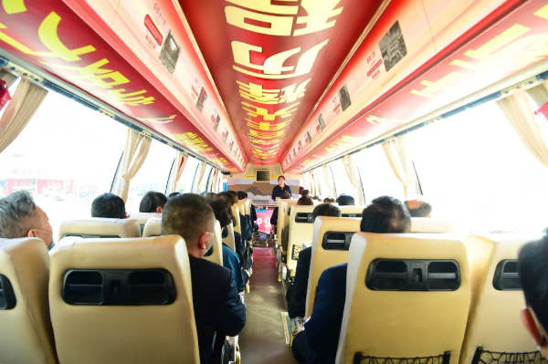 客车内室四周喷绘上红色主题文化元素,车顶部位印制的“中国共产党百年光辉历程”字样格外醒目,车顶两侧分别配以图文并茂的形式生动展现了“中共一大到十九大极简史”,特别是党的十八大以来,在以习近平同志为核心的党中央的坚强领导下,中国共产党取得的历史性成就和历史性变革。车内广告栏、行李架等位置设置了“学史明理 学史增信 学史崇德 学史力行”和“学党史 悟思想 办实事 开新局”宣传标语,车窗玻璃上贴有“学党史 听党话 感党恩 跟党走”字样,精心设计后的“党史学习教育移动课堂”形成了流动性、全方位、立体式、动感强的党史学习教育宣传模式,成为城市道路上一道亮丽的红色风景线。
