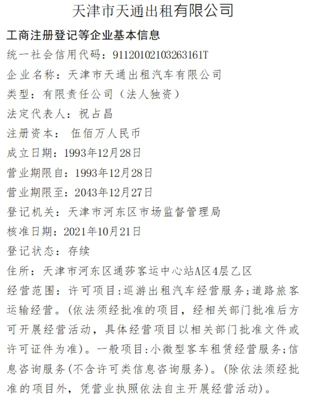 天津市天通出租汽车有限公司